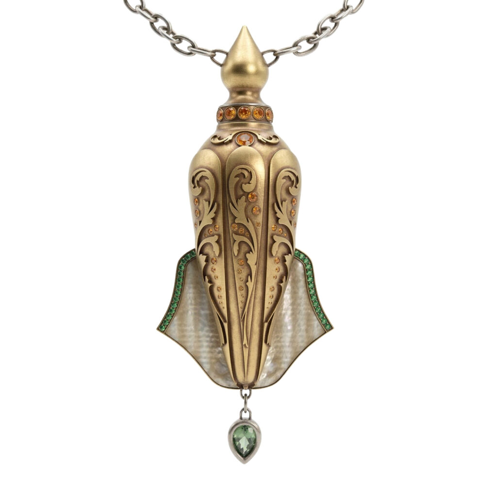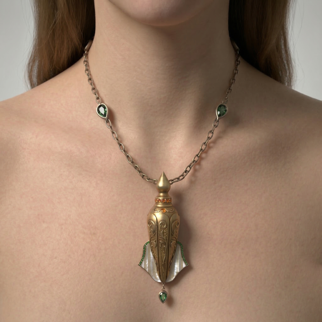 The piece is accented with orange gemstones and vivid green emeralds. Intricate botanical reliefs enhance the surface, while the design functions as a wearable perfume pendant, allowing the fragrance to be applied directly to the neck.
