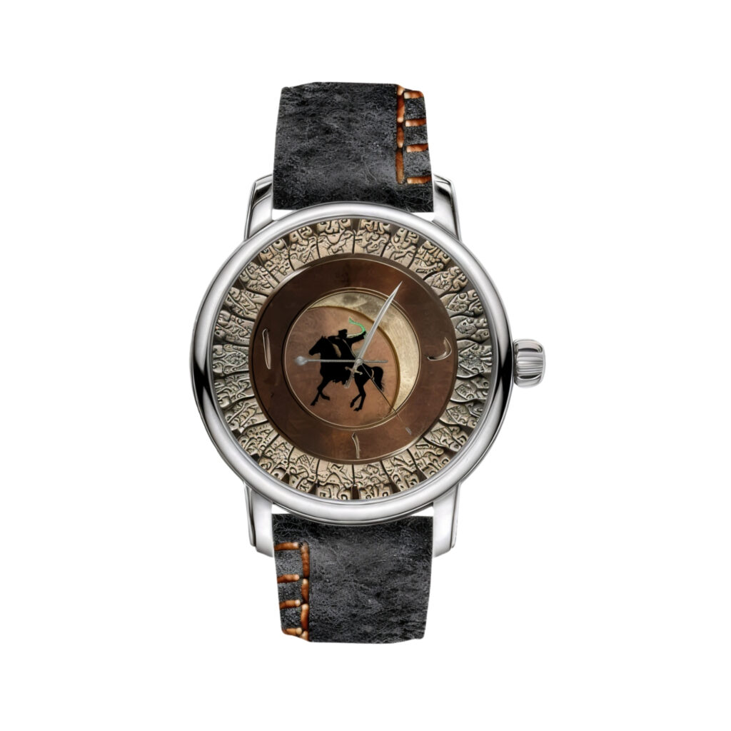 A turquoise arrow shoots toward the moon; each release represents energy and the rhythm of time. The figure stands at the center of the frame, surrounded by sculptures and fortress-like walls, creating a historical panorama within the watch. Its slim case offers an elegant presence on the wrist, without any outward thickness; light and sophisticated.